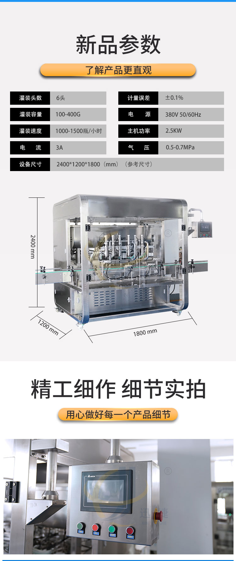 辣椒醬灌裝機(jī)采用活塞式灌裝原理,適用于調(diào)味品中帶顆粒并且濃度較大的辣椒醬、豆瓣醬、花生醬、香菇醬、果醬、牛油火鍋底料。