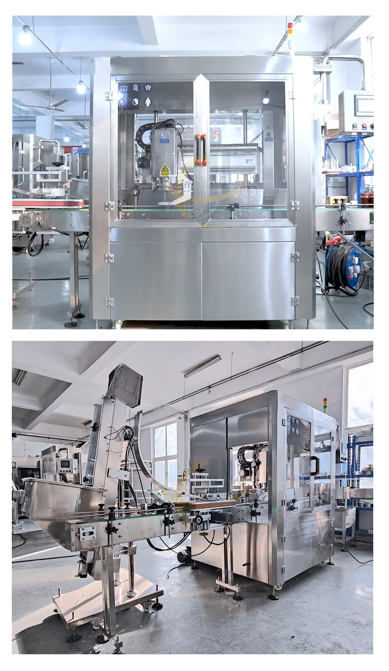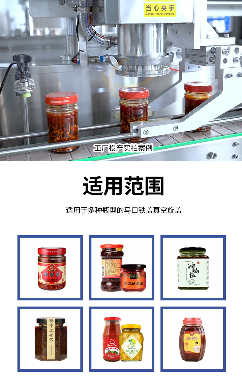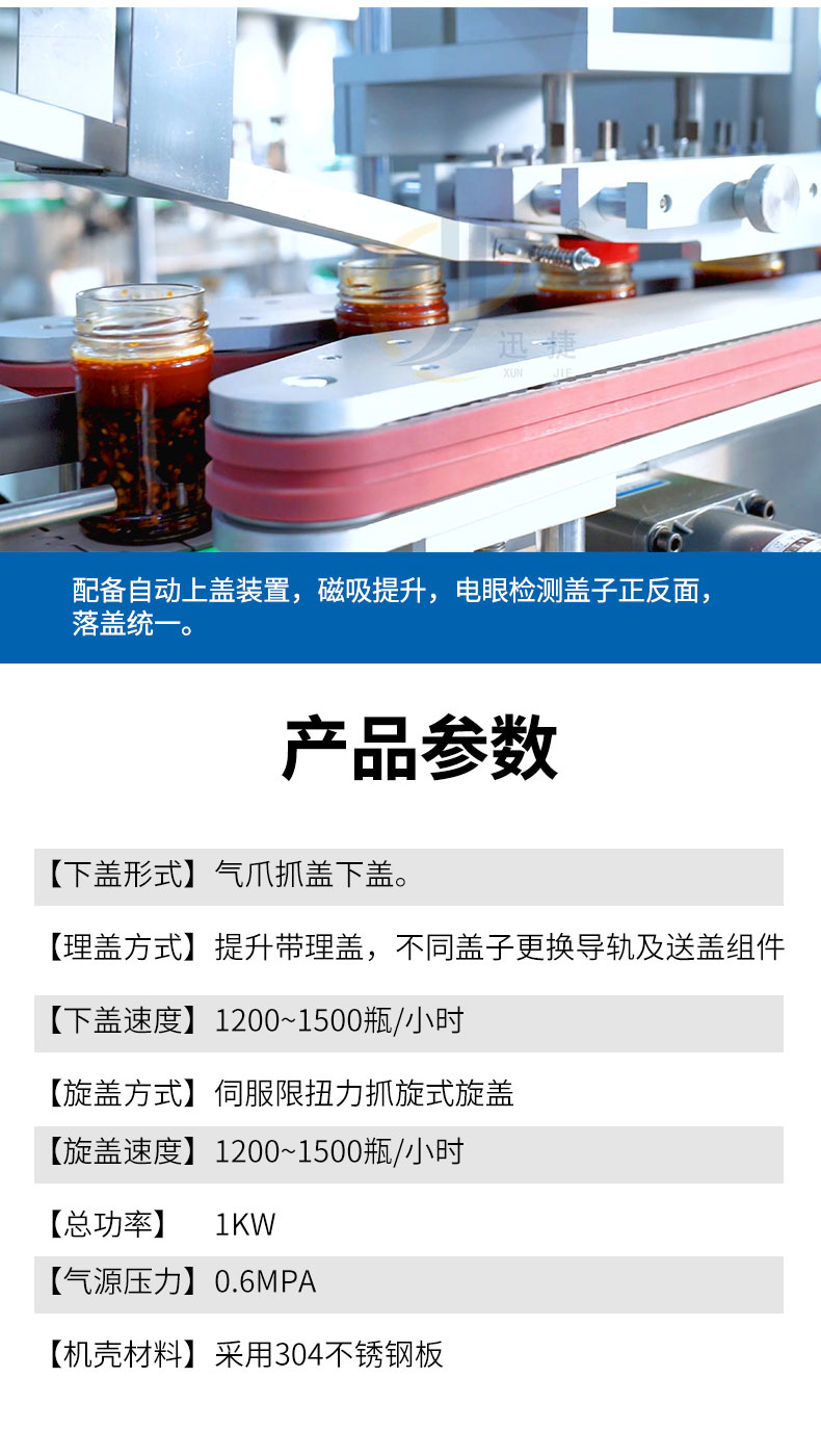 跟蹤式真空旋蓋機適用于多種瓶型的馬口鐵蓋真空旋蓋。設備由PLC結合觸摸屏控制,采用世界知名品牌電器和氣動元件,故障率低。