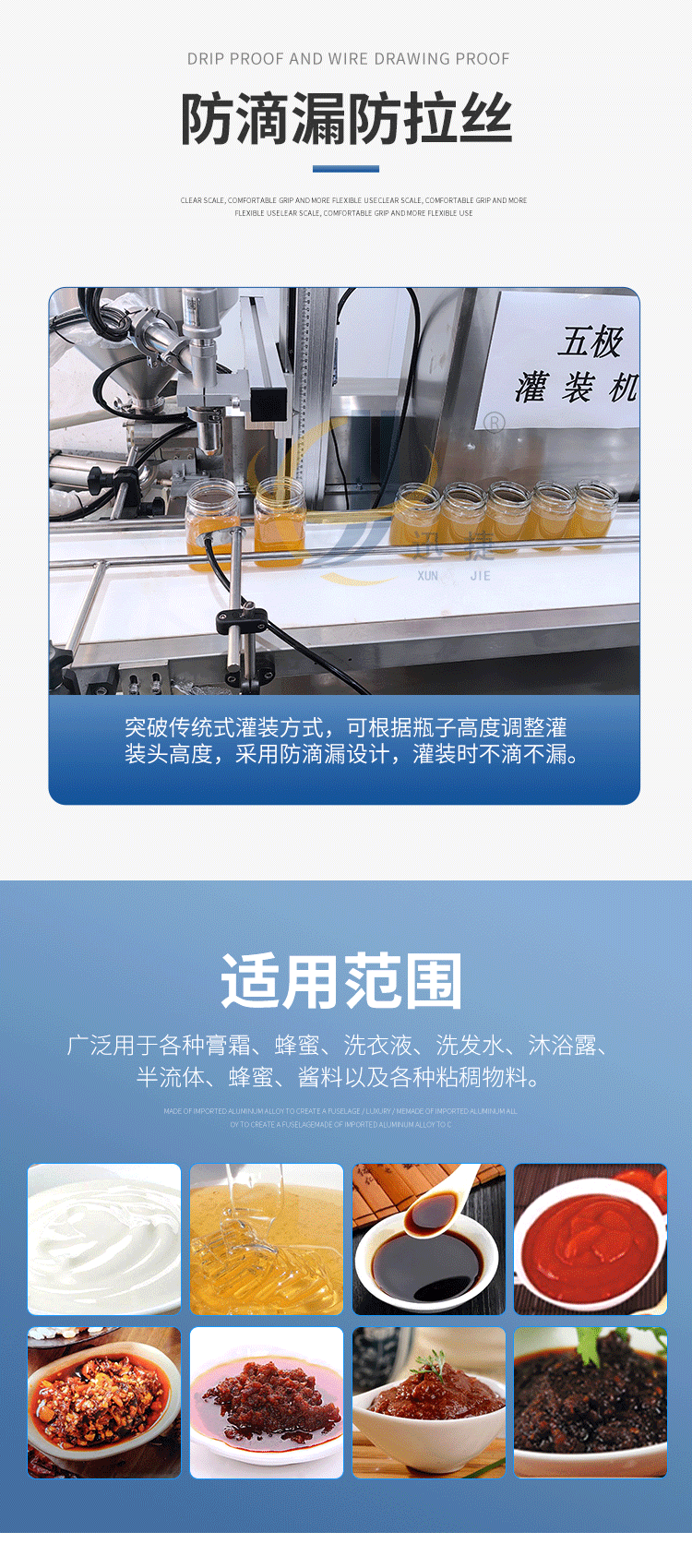 五極灌裝機(jī):極快-單頭2200瓶/時(shí) 極簡(jiǎn)-操作簡(jiǎn)單 極廣-啥啥都能灌 極穩(wěn)-24小時(shí)不停機(jī) 極準(zhǔn)-200g誤差小于1g。它可以和真空旋蓋機(jī)搭配使用。
