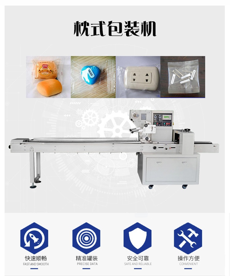 該枕式包裝機可用于餅干、月餅、蛋黃派、米餅、雪糕、方便面、巧克力等塊狀產(chǎn)品的包裝,特別適合于小批量單一產(chǎn)品的包裝。