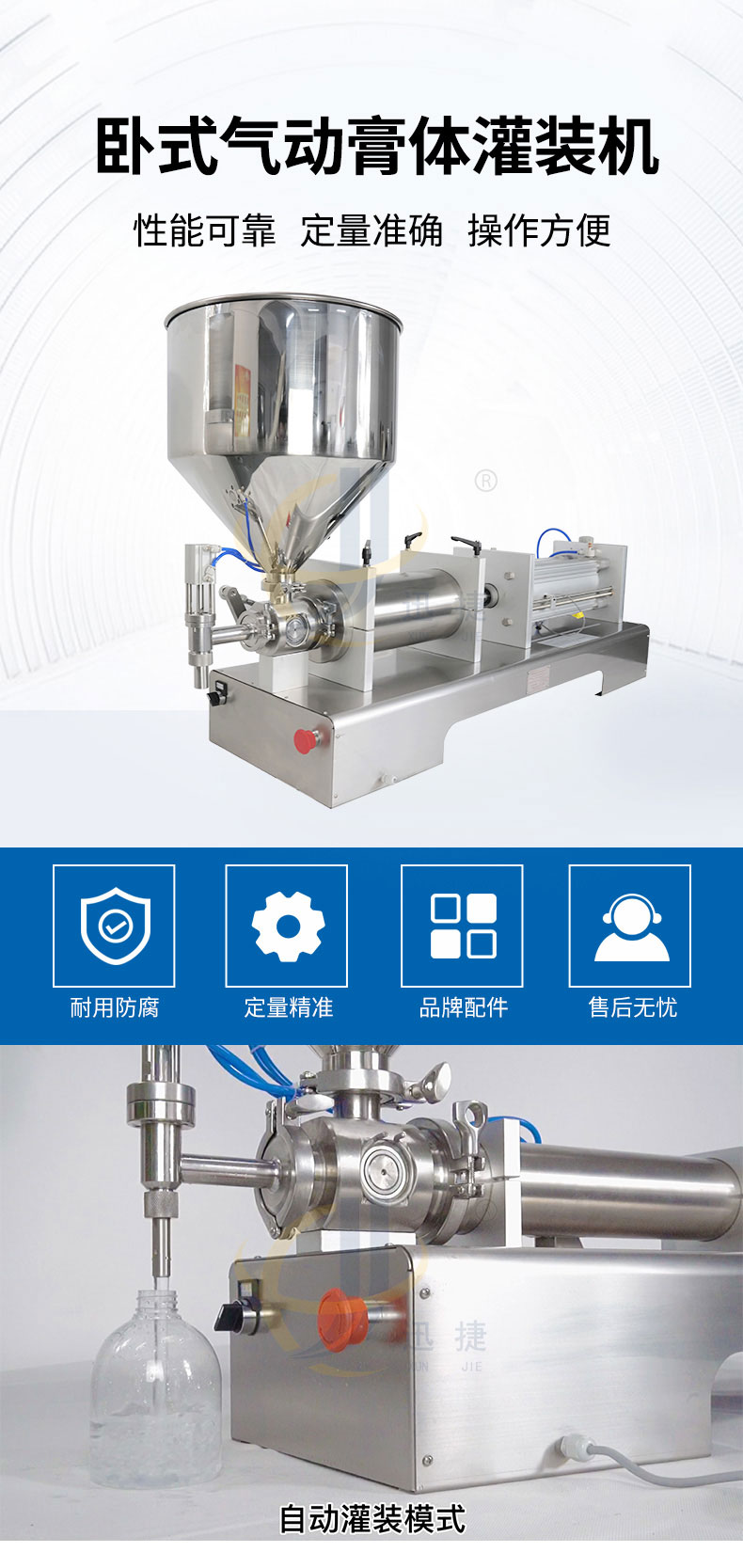 該機(jī)為半自動(dòng)膏體灌裝機(jī),是日化行業(yè)、醫(yī)藥行業(yè)、食品行業(yè)、油墨行業(yè)和涂料行業(yè)的理想灌裝充填設(shè)備,灌裝悶頭采用防滴漏。